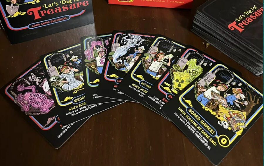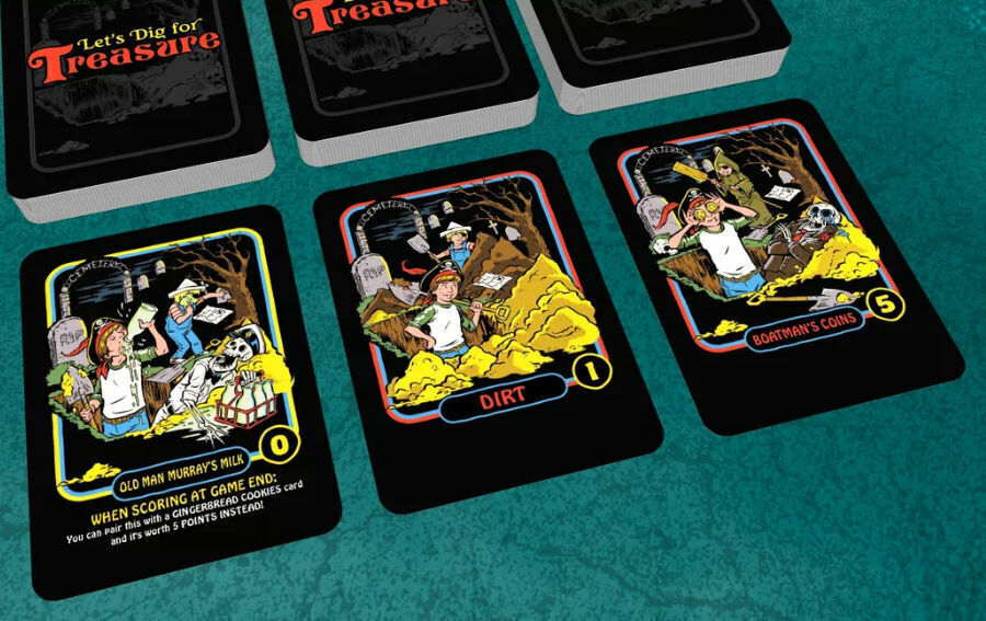 "Hay incontables objetos, misterios y gusanos esperando a ser desenterrados. Coge una pala y no te olvides de tu hermano pequeño... Busquemos tesoros! En cada turno EXCAVARÁS la carta superior de cualquiera de las 3 Pilas de Excavación. En realidad, puedes desenterrar tantas cartas como quieras: algunas te darán un efecto especial, mientras que otras te darán un montón de puntos. Pero ten cuidado: Si desentierras la carta equivocada, se acabará tu turno y no ganarás NADA. ¿Tendrás la templanza para saber cuándo abandonar y el entusiasmo para tentar a la suerte? En cuanto una de las Pilas de Excavación esté vacía, el juego habrá terminado y ganará quien haya conseguido más puntos."