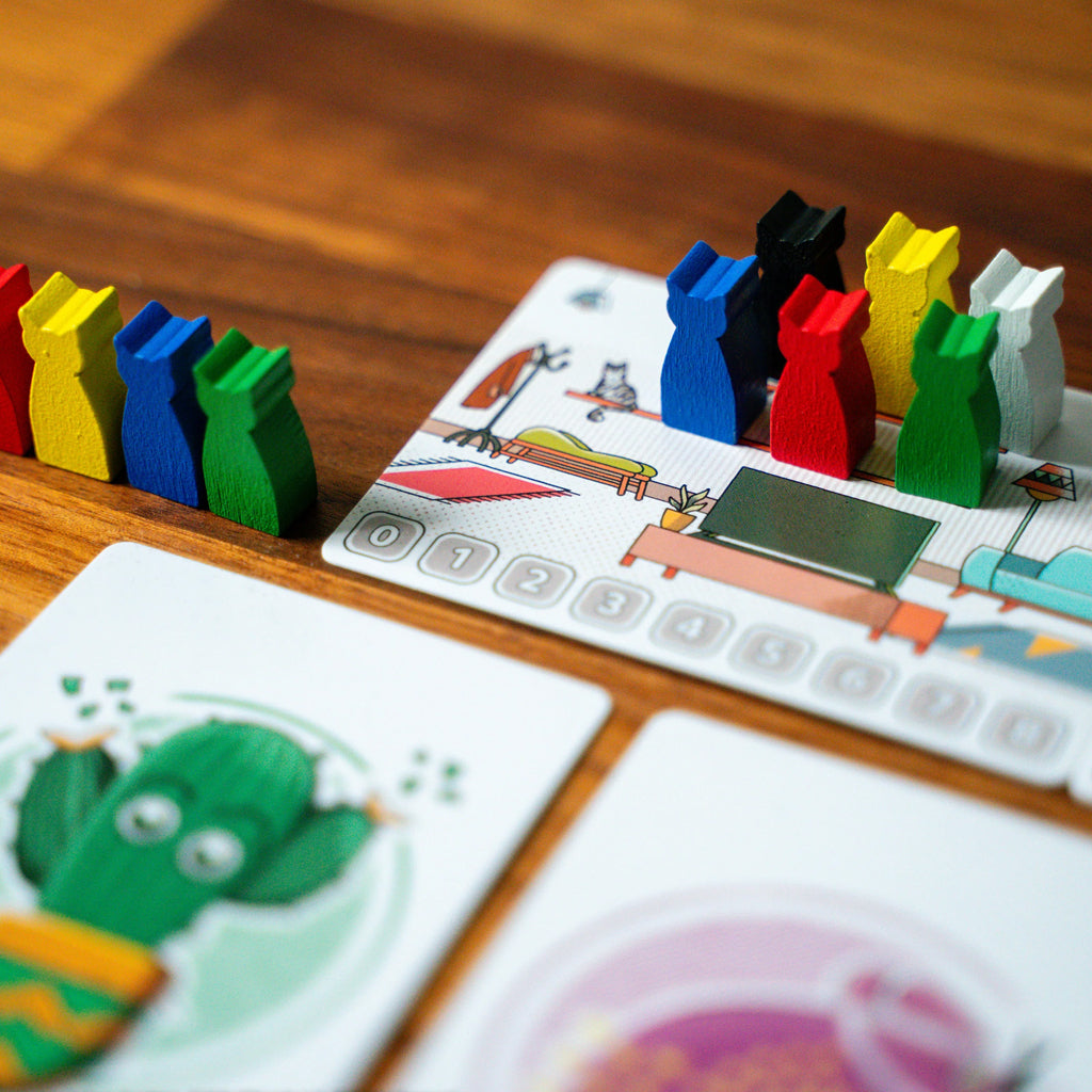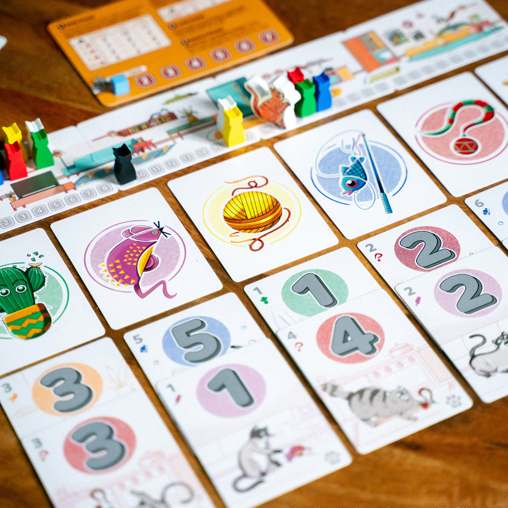 l turno consiste en jugar una carta de la mano en una columna. Es decir, debajo de los seis objetos dispuestos sobre la mesa con los que atraeremos a los gatos. Cada carta tiene un valor comprendido entre el 0 y el 6.
