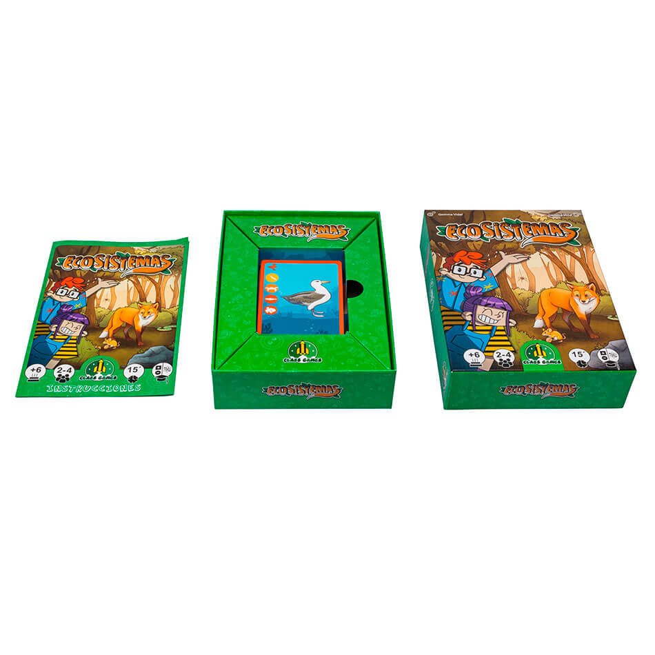 Ecosistemas es un juego de cartas donde tendrás que llegar hasta arriba de la cadena alimenticia. Elige tu ecosistema y busca los grandes depredadores antes que los demás jugadores. Conoce muchos seres vivos, 28 en total, y sus relaciones. Introdúcete en el bosque, mar o desierto y descubre que los seres vivos tienen distintas posiciones en esta cadena: herbívoros, omnívoros, carnívoros o insectívoros.