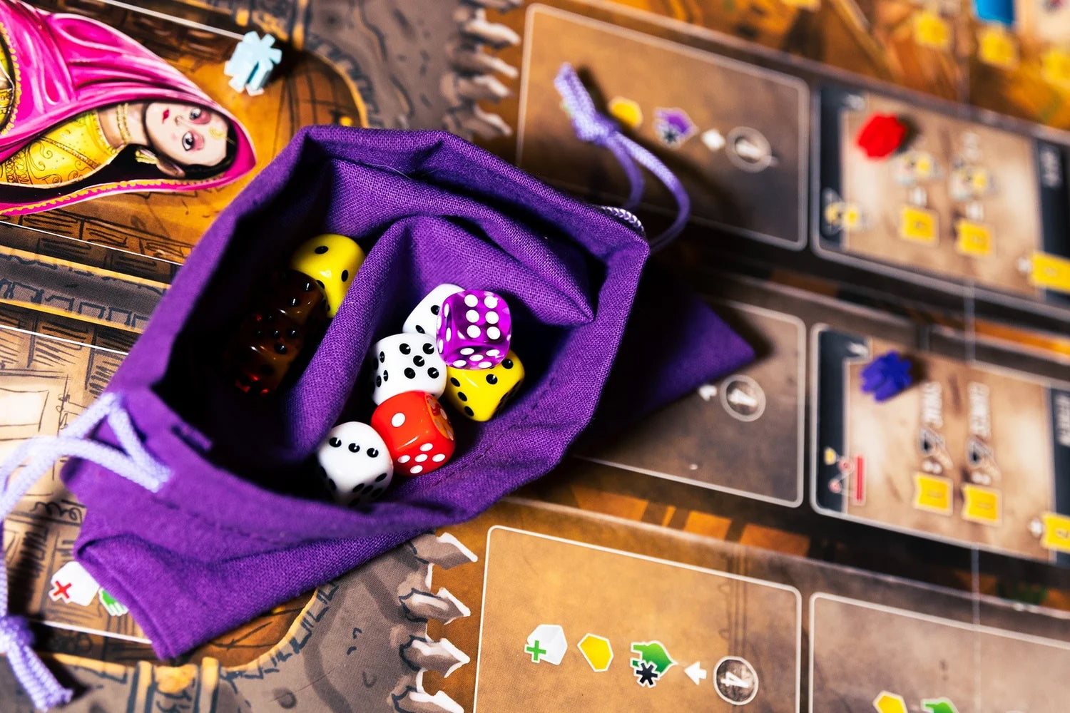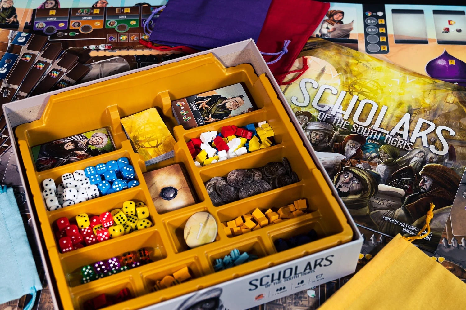 Eruditos de las tierras del Sur se ambienta en el apogeo del Califato Abasí, alrededor del año 830 d. C. El Califa convocó a las mentes más brillantes para adquirir manuscritos científicos de todo el mundo conocido. Los jugadores deberán aumentar su influencia en la Casa de la Sabiduría y contratar lingüistas expertos para traducir los pergaminos extranjeros al árabe. En esta Edad de Oro de sabiduría y conocimiento, tengan cuidado de no descuidar uno en pos del otro.