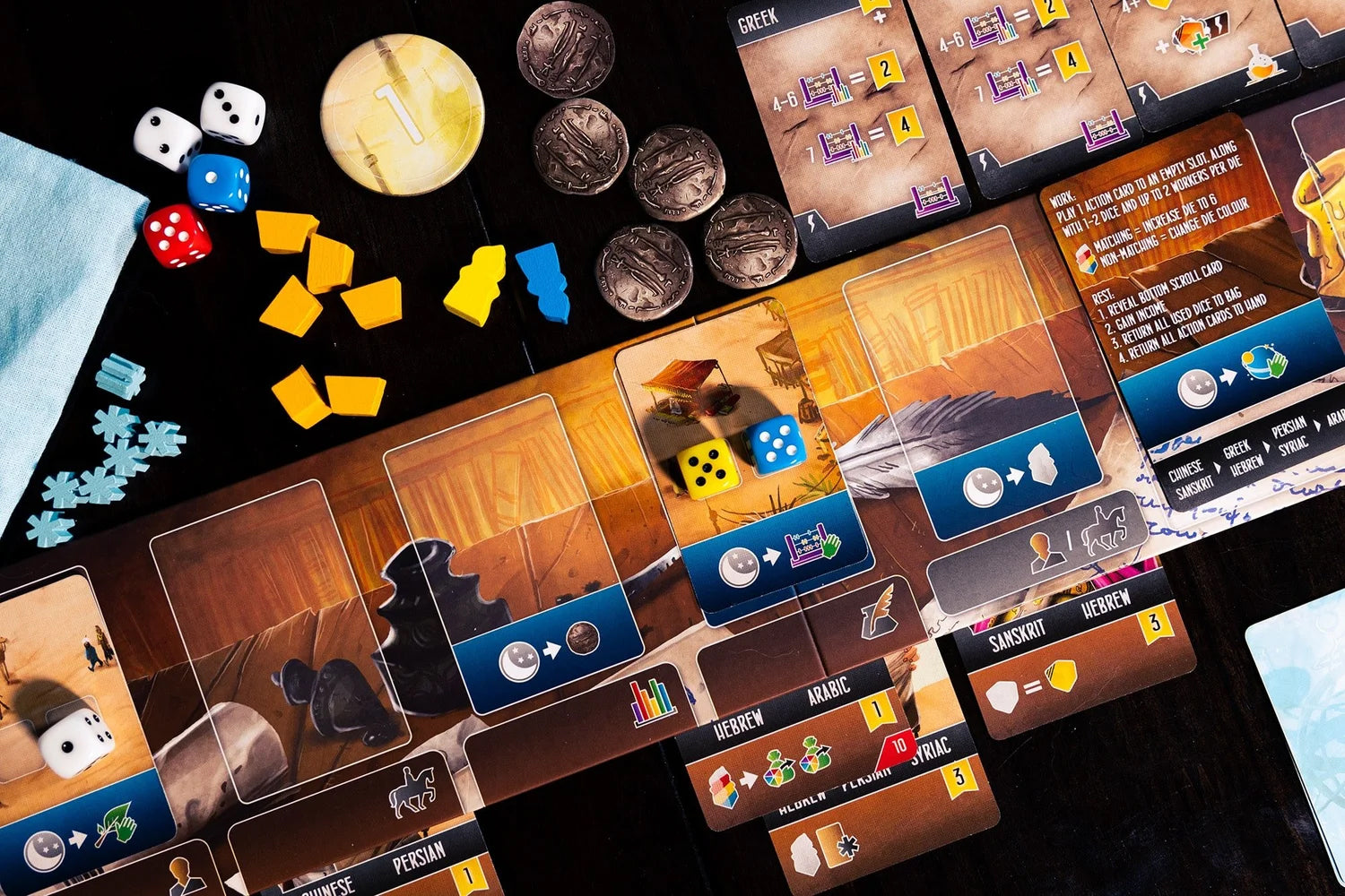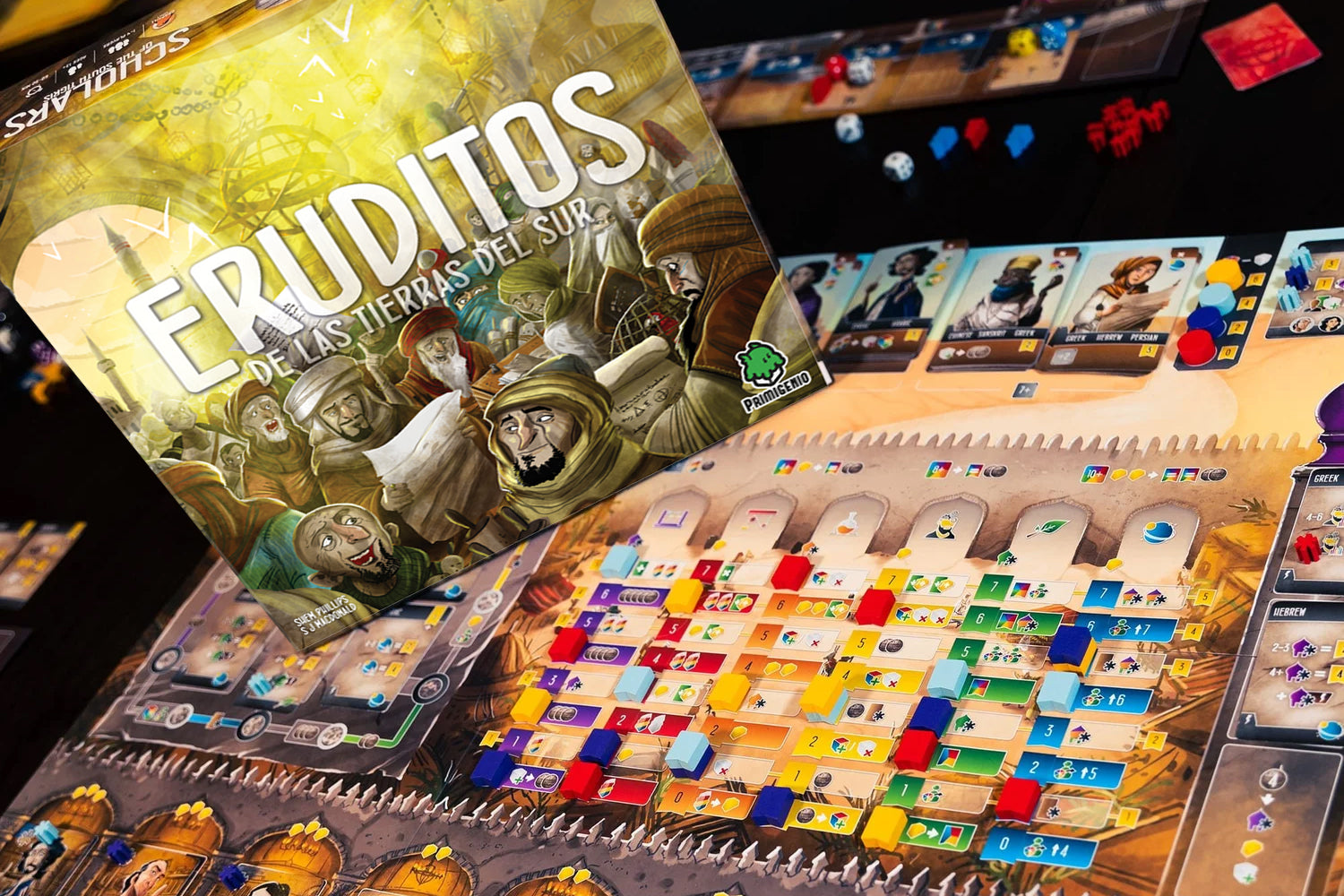 Eruditos de las tierras del Sur se ambienta en el apogeo del Califato Abasí, alrededor del año 830 d. C. El Califa convocó a las mentes más brillantes para adquirir manuscritos científicos de todo el mundo conocido. Los jugadores deberán aumentar su influencia en la Casa de la Sabiduría y contratar lingüistas expertos para traducir los pergaminos extranjeros al árabe. En esta Edad de Oro de sabiduría y conocimiento, tengan cuidado de no descuidar uno en pos del otro.