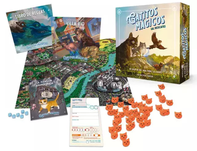 Gatitos Mágicos ¡al rescate! es un juego de rol sencillo, rápido, divertido... y perrrfecto para pequeños y mayores. Esta caja contiene todo lo necesario para introducir a tus humanos favoritos en el mundo de los juegos de rol, incluyendo un cómic-aventura para aprender las reglas básicas en unos pocos minutos.