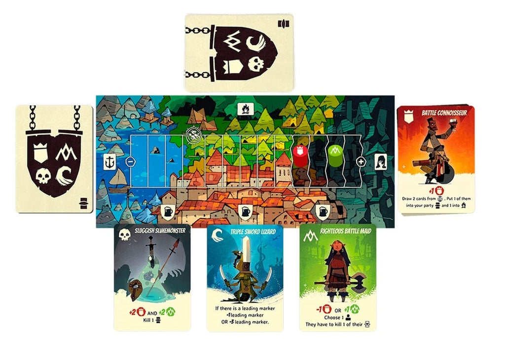 Durante la partida, los jugadores juegan cartas de héroe para influir en el poder de las Tribus de las Colinas (marcador