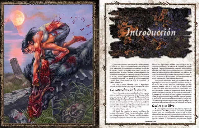 Hombre Lobo: El Apocalipsis irrumpió con un rugido en el mundo de los juegos en 1992, inspirando a una generación de seguidores a levantarse y aullar en desafío ante un mundo corrupto en una batalla que sabían que estaban destinados a perder. Hombre Lobo presentó a los Garou: criaturas que eran al tiempo hombre y lobo, y que estaban llenas de Rabia contra los males que podian destruir y corromper tanto el mundo natural como el espiritual. Capaces de transformarse en una gama de Formas y bendecidos con Dones que les conferían Poderes sobrehumanos y sobrenaturales, los Garou combatieron muchos enemigos, sabiendo siempre que al final perderían. Pero ¡qué historias se narrarían y qué canciones se cantarían de sus hazañas!
