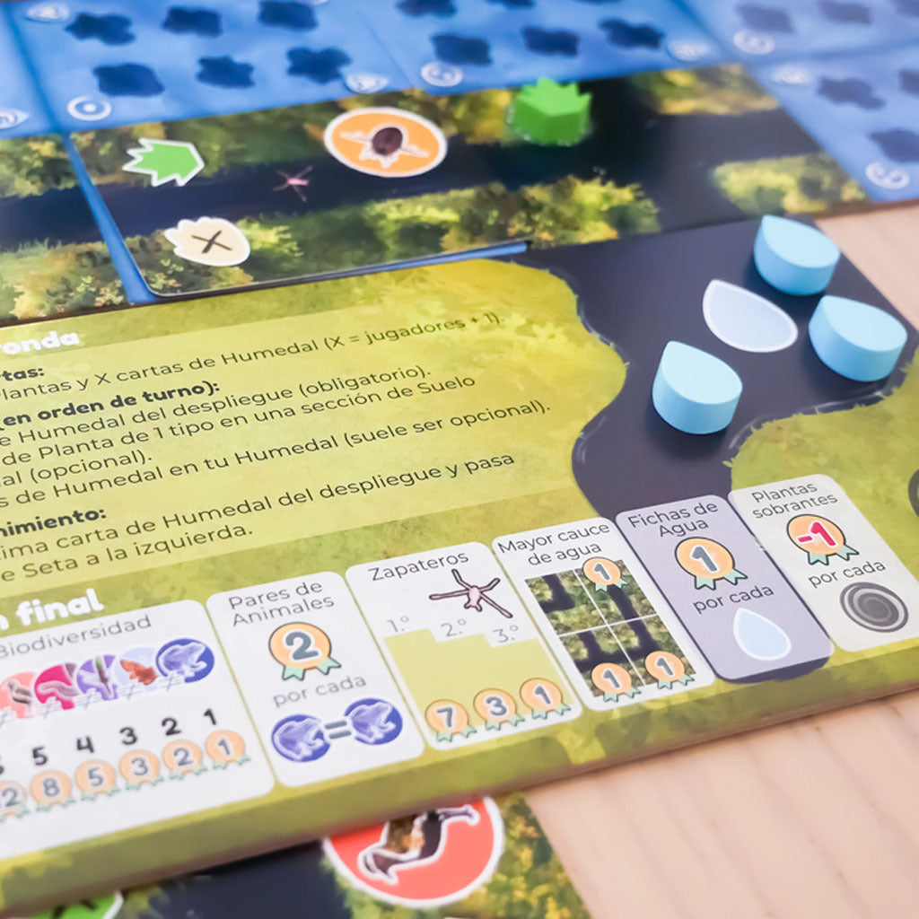 Crea hábilmente una red de canales de agua por la que «fluyan» tus fichas de planta a todos los rincones de tu humedal. Si lo haces bien, podrás jugar las mejores cartas y crear un ecosistema más provechoso que los de tus oponentes.