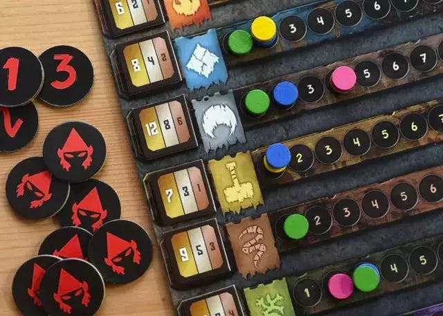 | 1 Tablero doble cara 5 Tableros de jugador 1 Tablero de clanes 7 Losetas de voto 1 Rueda gnoma 10 Losetas de Guarida (2 por jugador) 44 Cartas de campeón 21 Losetas de campeón 5 Losetas de campeón de oleada III 72 Cartas de Linaje 5 Cartas de inicio 12 Fichas de gran salón 12 Fichas de desesperación 7 Cartas de puerta 1 Marcador de jugador inicial 17 Cartas mini-expansión de retos 1 Ficha de turba 1 Peón de rueda 30 Fichas de Gnomo 150 Cubos de linaje de madera 65 Discos de influencia de madera 125 Troles de madera 25 Campeones de madera |