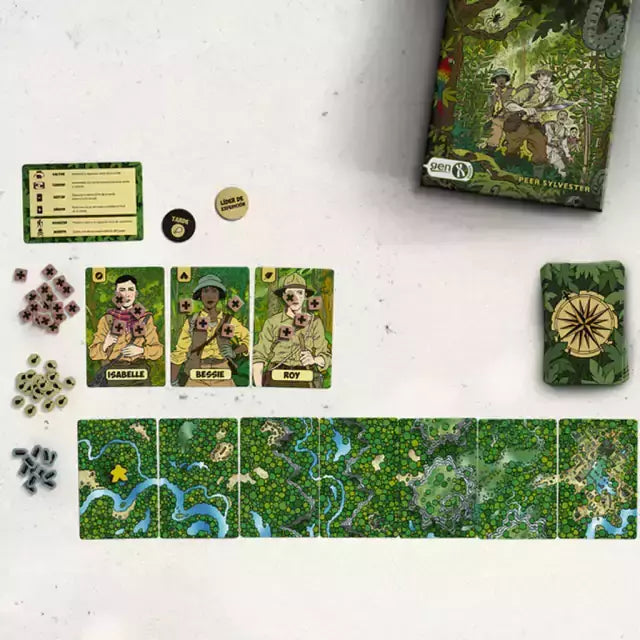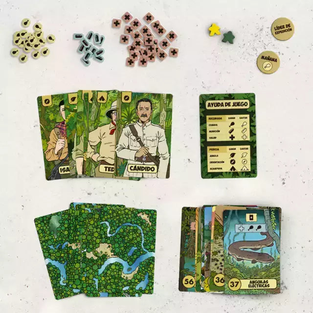 | 6 Cartas de Explorador 9 Cartas de Expedición 54 Cartas de Aventura 28 Fichas de Salud 21 Fichas de Comida 12 Fichas de Munición 2 Peones 1 Ficha de Mañana/Tarde 1 Ficha de Líder de la expedición 1 Ayuda de Juegos 1 Reglamento |