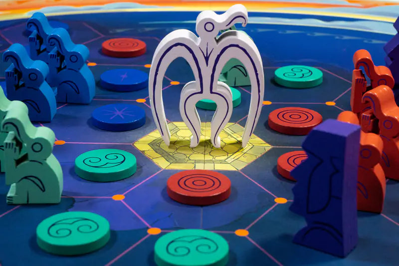 A continuación, en la fase ceremonial, si tienes el control de tres territorios que rodean un terreno ceremonial, colocas una de tus fichas de Tangata Manu en este terreno ceremonial. Si pierdes el control de uno de estos territorios, retira el Tangata Manu del tablero y devuélvelo a su reserva.