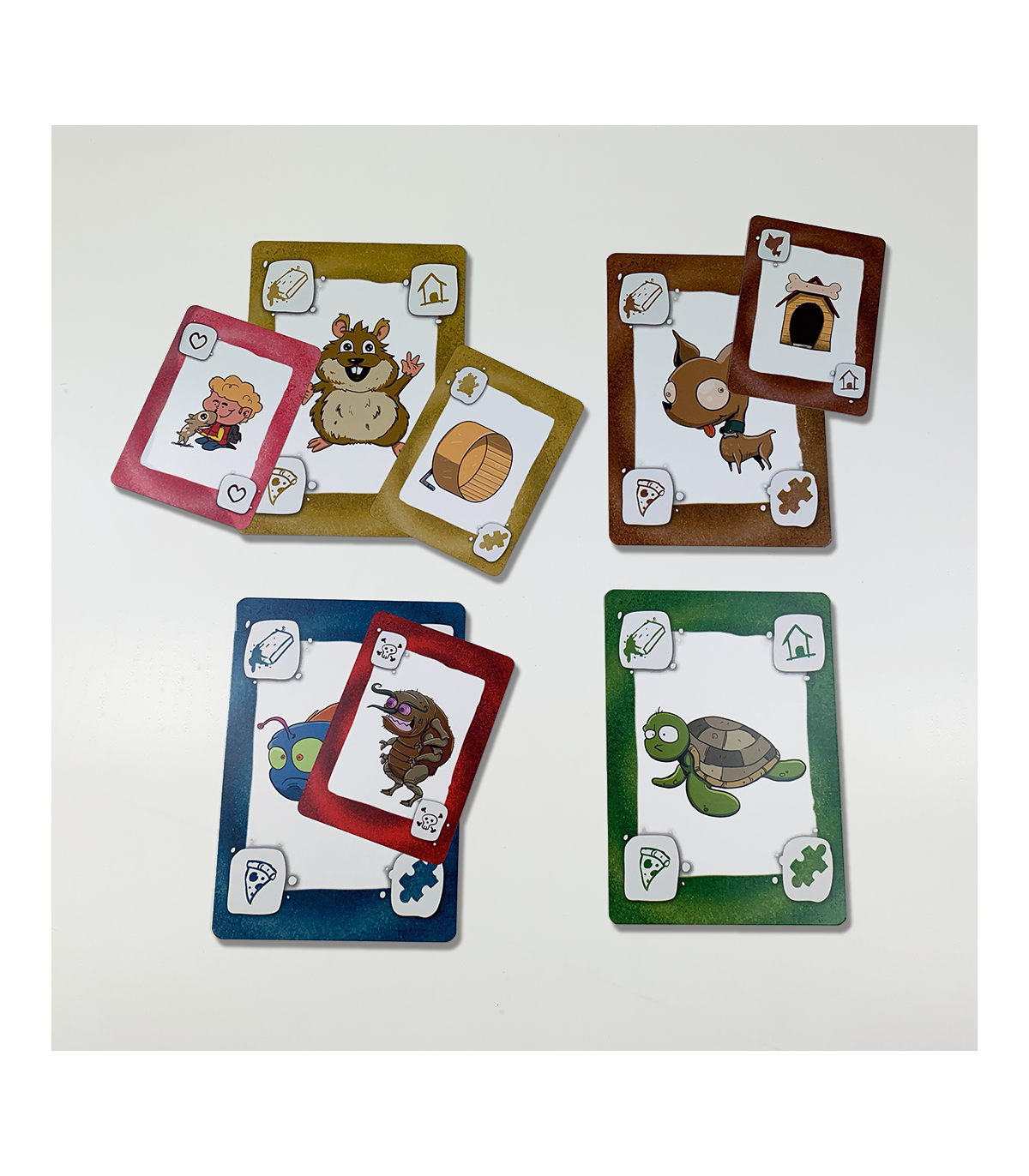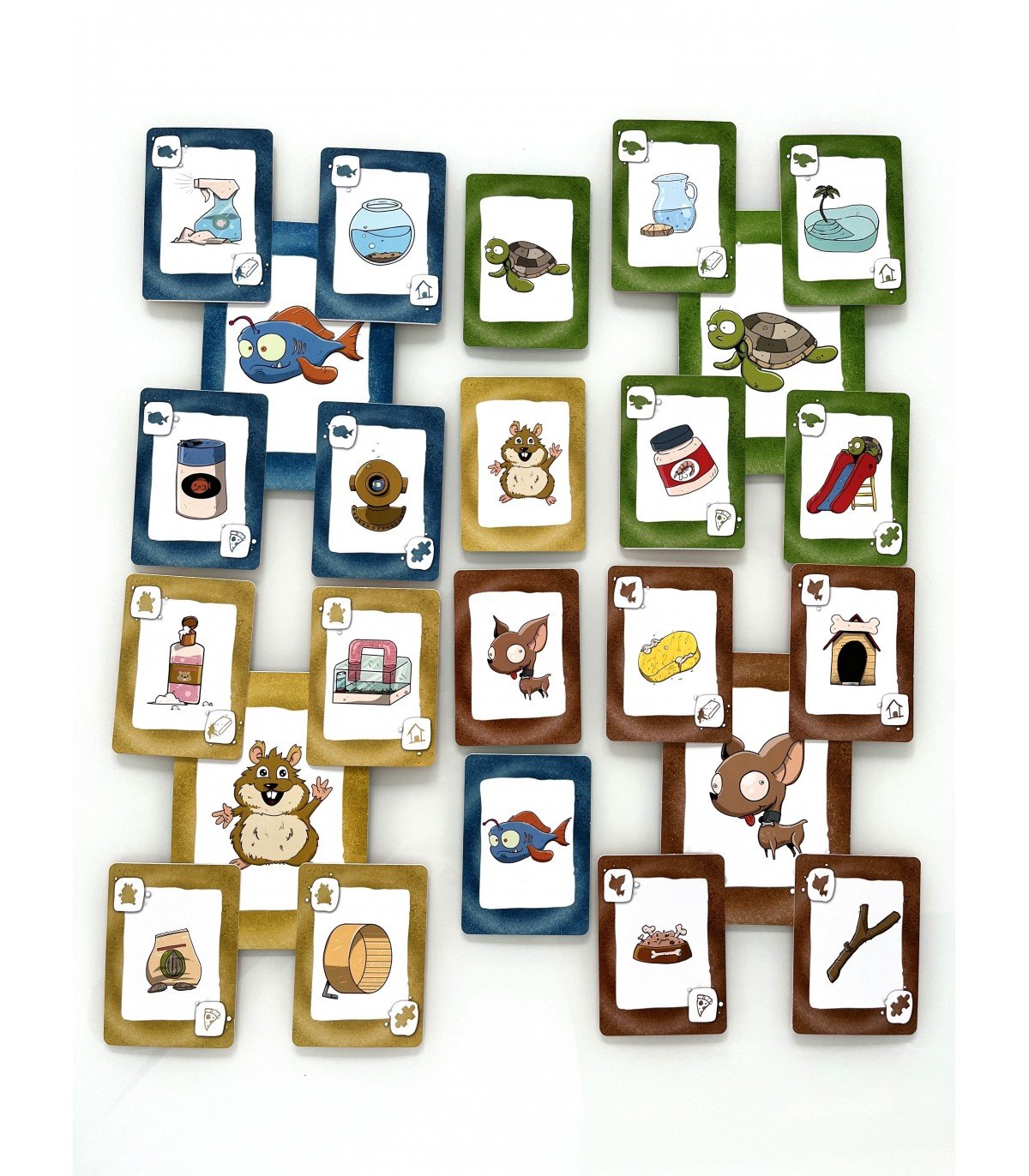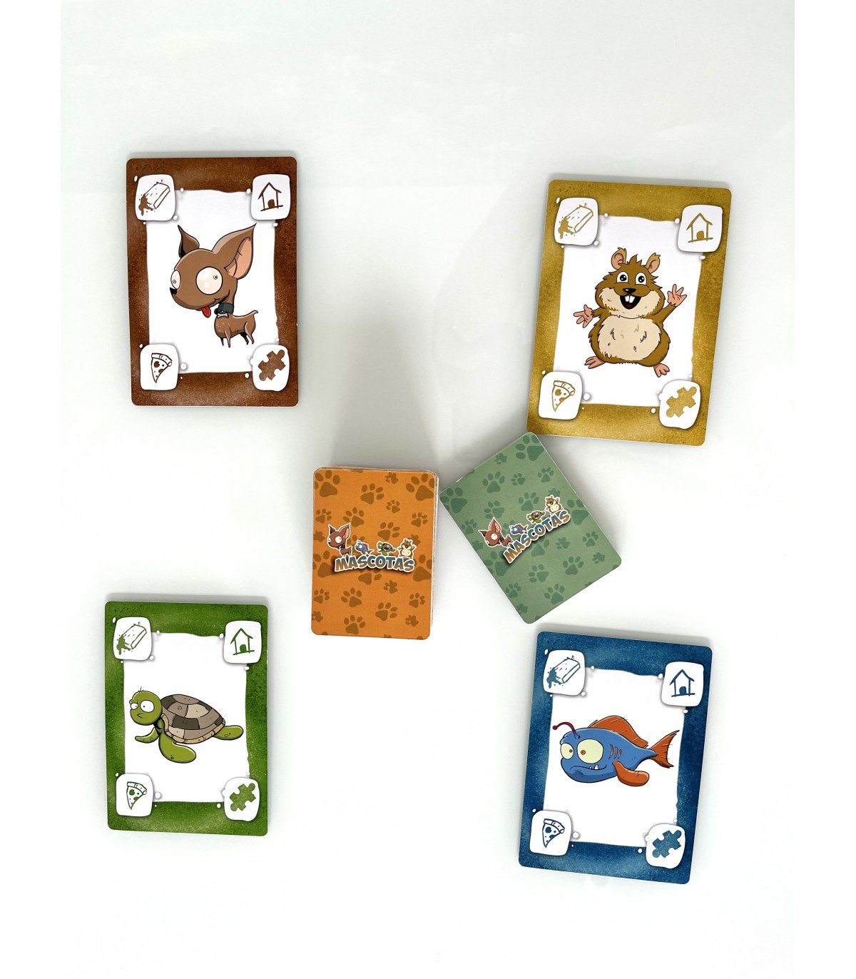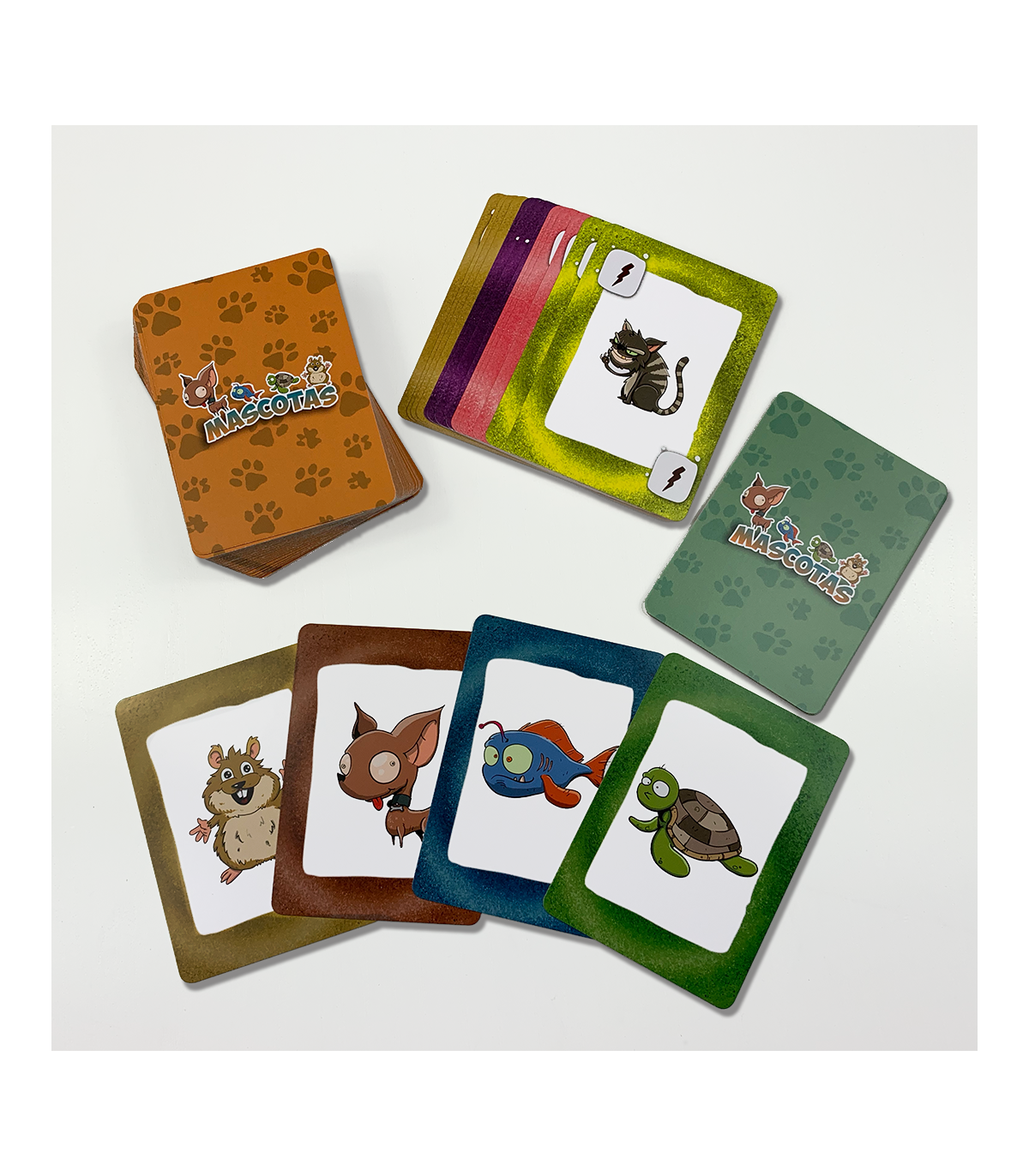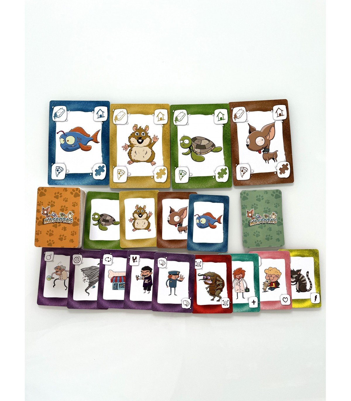 "Mascotas" es un divertidísimo juego de mesa para todas las edades que contiene ochenta y dos cartas, cuatro cartas grandes de mascota, así como reglas de juego en español e inglés.