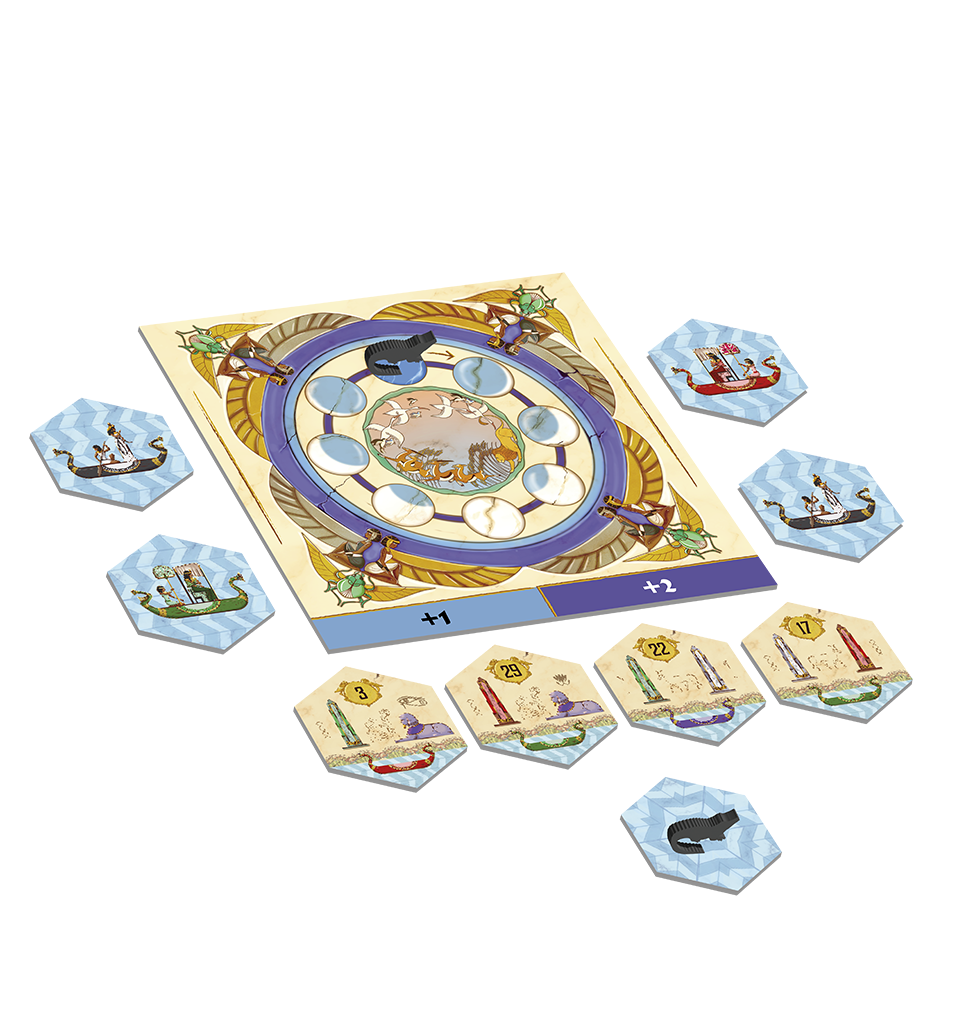 Por turnos construyan edificios en la ribera, la loseta con el valor más bajo determinará la dirección en la que el río seguirá creciendo. Cada construcción de tu color que sobreviva al final de la partida otorgará puntos. El participante con más puntos, tomará el control del río Nilo.