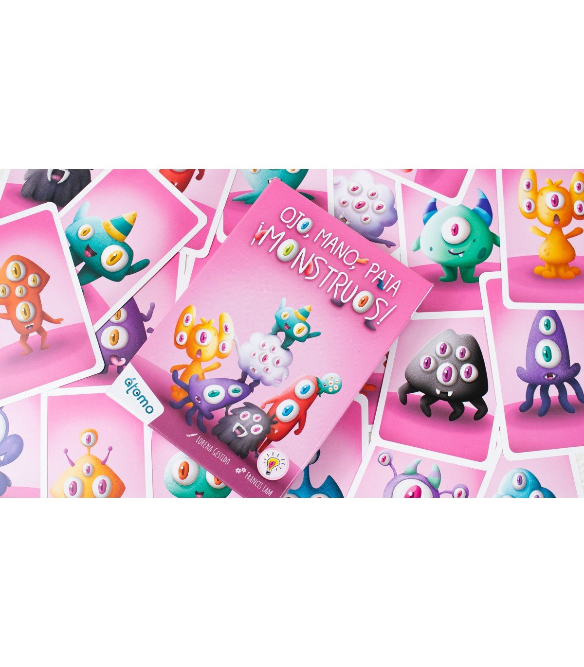 "Ojo, Mano, Pata, Monstruo" es un juego de cartas para los más pequeños de la casa, de 2 a 4 jugadores. Tendrán que averiguar rápidamente cuántos ojos, manos y patas tienen los monstruos.