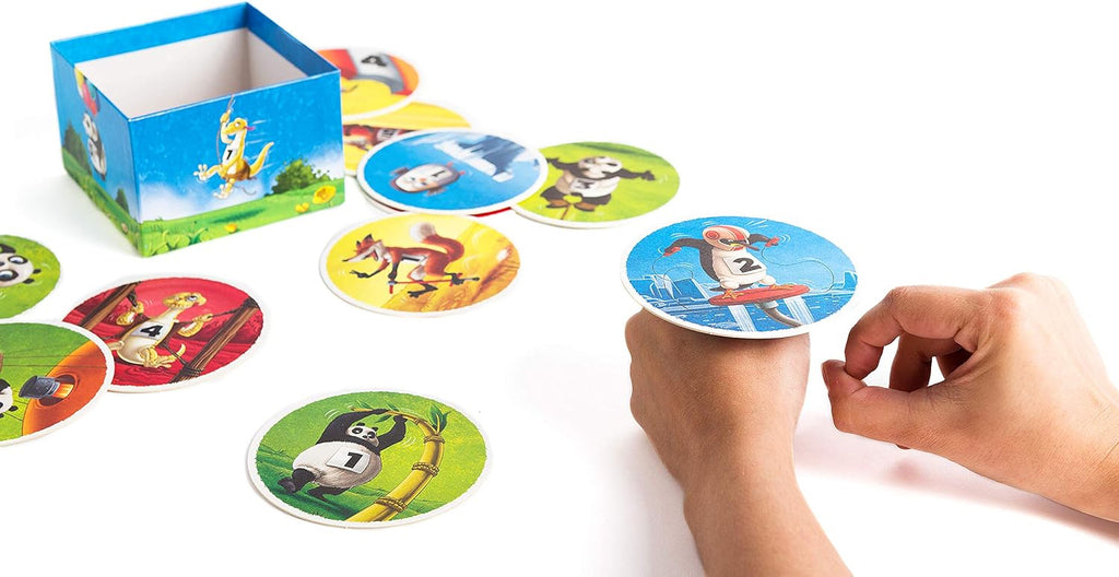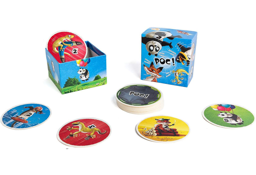 POC! es un divertido juego de habilidad para toda la familia que consiste en encestar las fichas de animales en la caja. Para ello, colocaremos una ficha encima de nuestro puño y le daremos un golpe con la otra mano.
