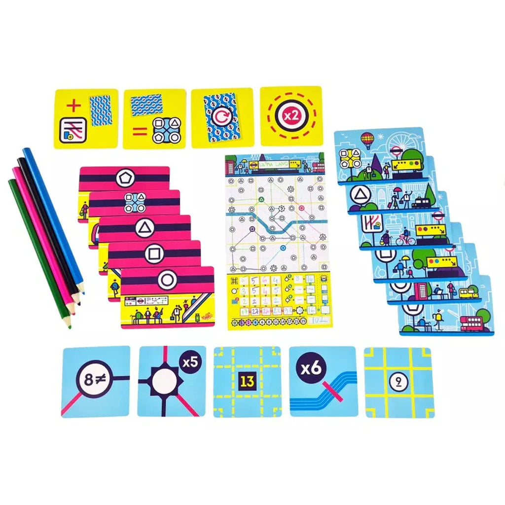 Hay una baraja de cartas con símbolos como las estaciones. Cada carta/símbolo que va a la mesa hará que tengas que hacer, en tu papel, una línea a una de las estaciones que tiene ese símbolo. Hay varias opciones, pero también muchos desafíos que resolver. Las líneas no se pueden cruzar, hay estaciones que valen más que otras y es necesario cruzar el río tantas veces como sea posible para que ningún ciudadano se sienta agraviado.
