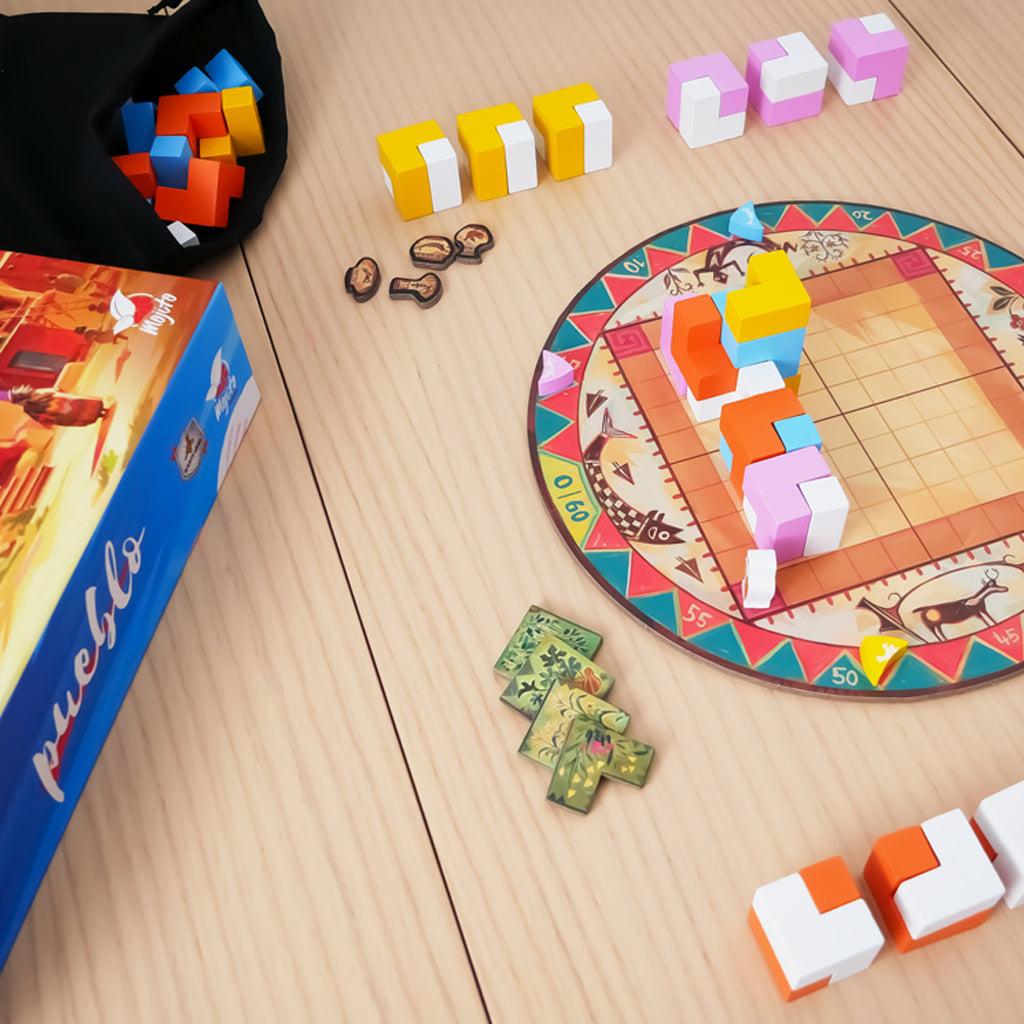 Pueblo es un juego de tablero en el que, junto con los demás jugadores, tendras que trabajar para crear un hogar poderoso para el jefe de la tribu. Tendrás que demostrar que eres el mejor artesano de la comarca y, de esta forma, podrás convertirte en un auténtico maestro constructor. ¡Ten cuidado con el Cacique! Si consigue ver tus piedras de marca, serás penalizado.