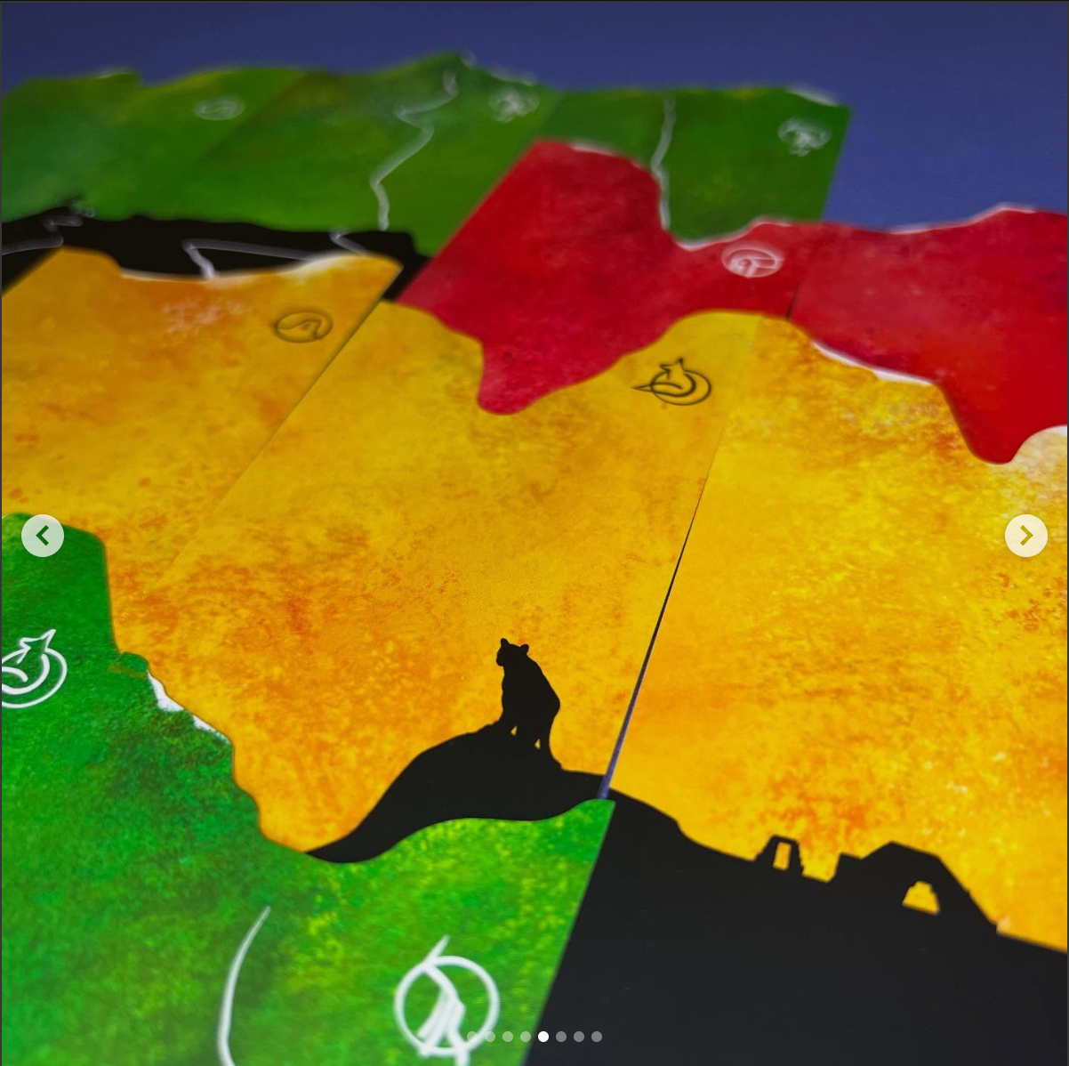Cartas recortadas que forman montañas y paisajes preciosos. Es un juego que relaja solo con verlo en mesa.