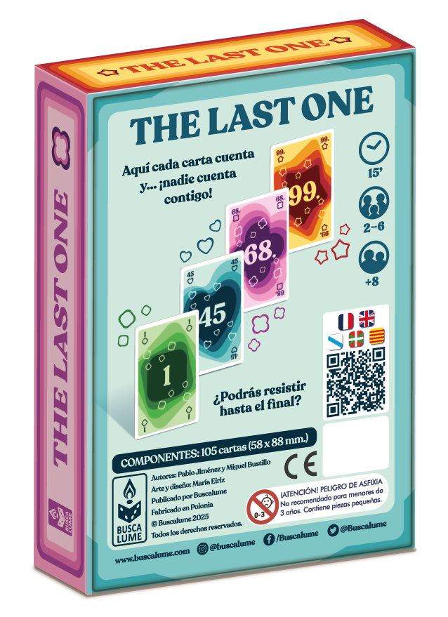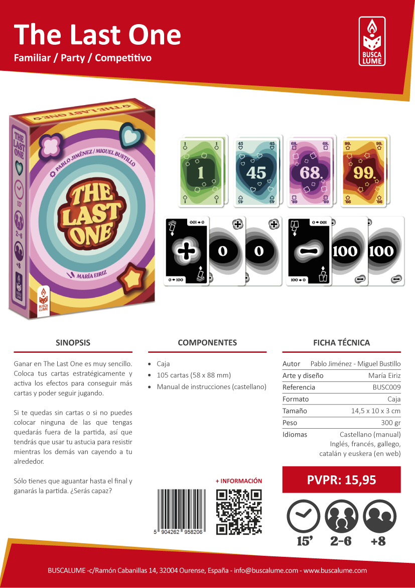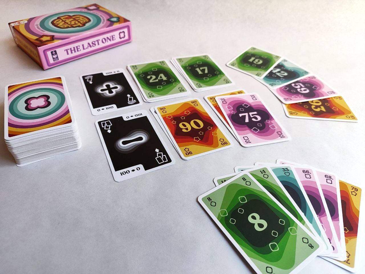 "The Last One" consiste en una baraja con cartas numeradas del uno al noventa y nueve, más seis cartas que forman la zona de juego. Jugarás tus cartas de número en dos filas: en la fila "más" colocarás cartas en orden ascendente y en la fila "menos" en orden descendente. Además, podrás activar efectos que te permitirán robar cartas, a tus rivales o del mazo.