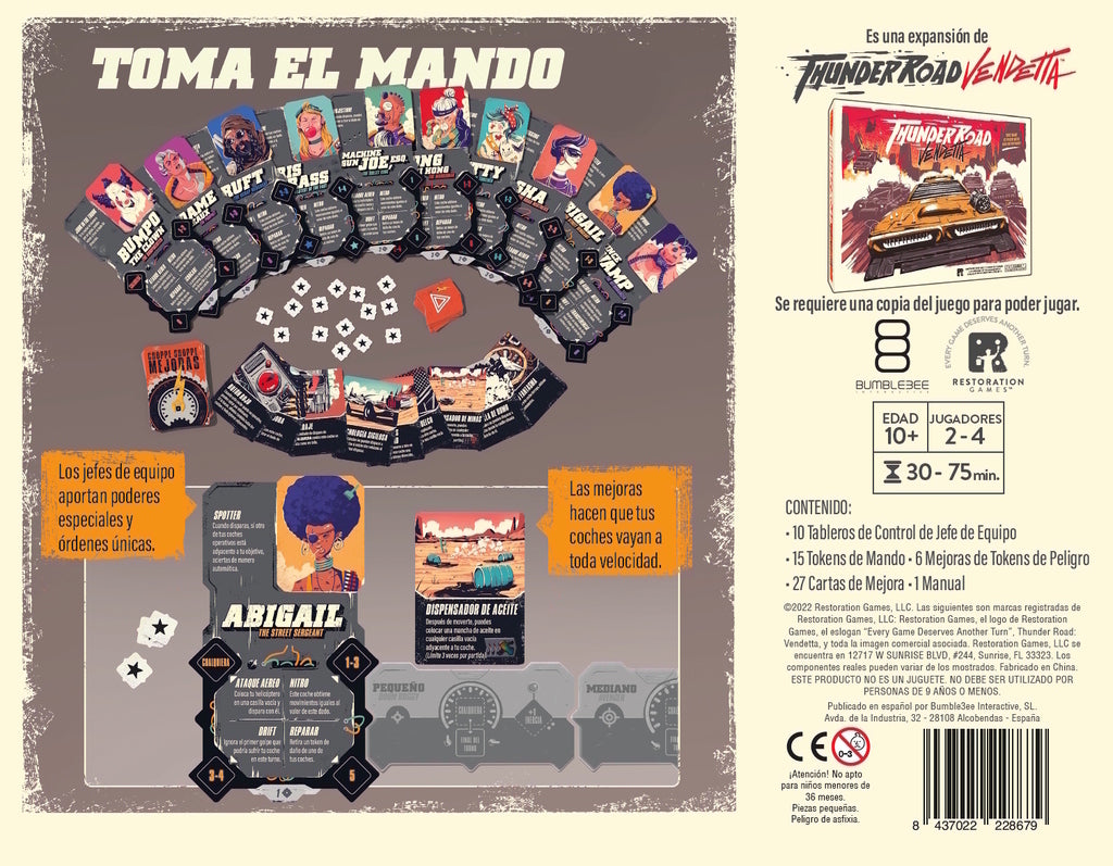 THUNDER ROAD SHOPPER CHOPPER. Thunder Road Vendetta: Choppe Shoppe es una expansión para el juego de mesa Thunder Road: Vendetta con la que podrás añadir nuevos jefes de equipo y mejoras a tus partidas y volver a sentir la emoción del asfalto. Pisa el acelerador a fondo! Algunas carreras son más grandes que otras. En la carrera más grande de todas, necesitas un líder veterano y algo de equipo extra para llegar a lo más alto. Esta expansión añade jefes de equipo y mejoras para los coches. Los líderes de tripulación proporcionan tableros de mando personalizados y poderes de jugador variables. Las mejoras de coche añaden efectos especiales a cada uno de tus coches.