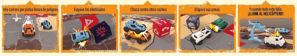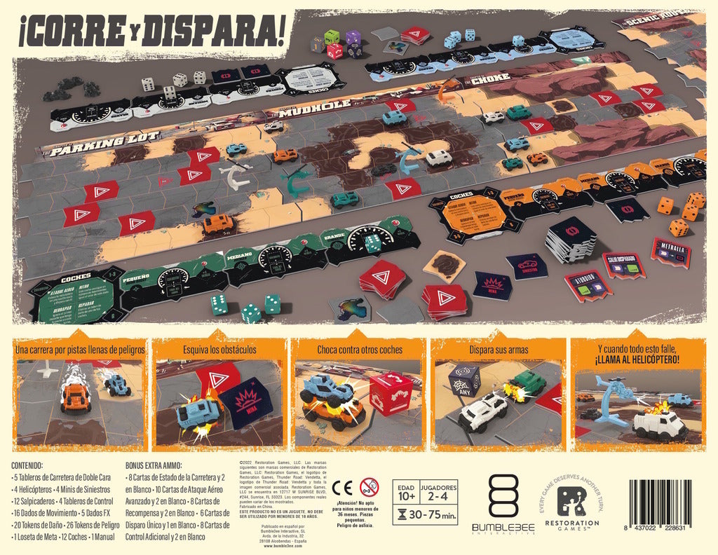 THUNDER ROAD VENDETTA EDICION EXTRA AMMO. Thunder Road Vendetta: Edición Extra Ammo es un juego de mesa que vuelve con una revitalizada restauración del clásico juego de 1986 de caos sobre el asfalto. Coge a tu equipo, tira los dados, corre con tus coches, dispara tus armas e intenta que no te destrocen. Disfruta como nunca con un juego totalmente revolucionado y recargado! Thunder Road: Vendetta es un juego de turnos rápidos y decisiones arriesgadas. Dirige a tu equipo mientras recorren peligrosas carreteras, esquivan peligros, chocan contra coches y disparan sus armas. Y cuando todo lo demás falle, llama al helicóptero! Esta nueva versión incluye emocionantes novedades, como fichas de peligro aleatorias, como accidentes, manchas de aceite y mucho más. El daño no es simplemente uno y ya está. Ahora sacarás fichas de daño con efectos emocionantes que pueden hacer que tu coche se desplace por el tablero. También tendrás más opciones en tu turno, asignando uno de tus dados a tu tablero de mando para reparar daños, aumentar el nitro o enviar tu helicóptero de ataque para disparar.