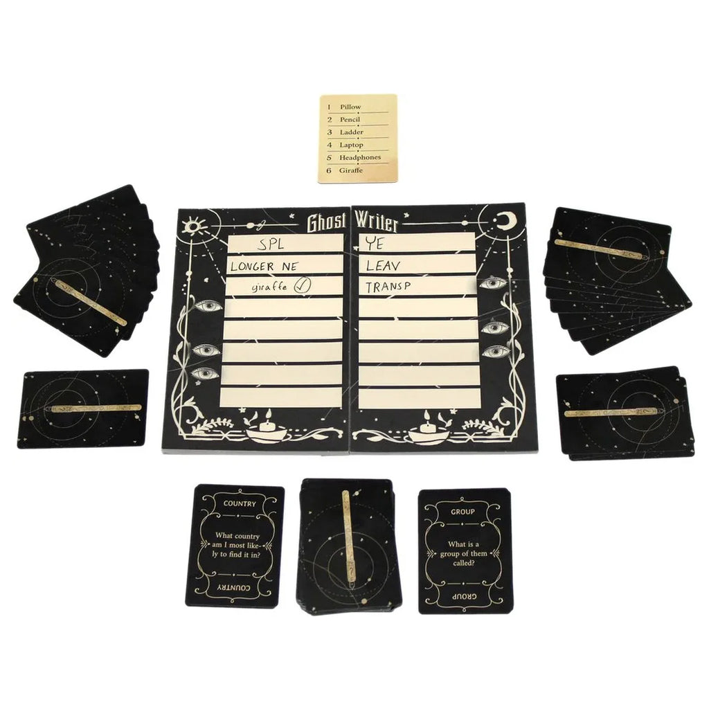 En cuanto los médiums crean haber adivinado la palabra, gritan "¡Silencio!" y el espíritu debe dejar de escribir. Es posible que el otro equipo de médiums sólo consiga ver una "d"; pero si sabéis que la pregunta es "¿De qué color es?", está claro que la respuesta es "dorado". Para terminar el turno, roba dos nuevas cartas de pregunta.