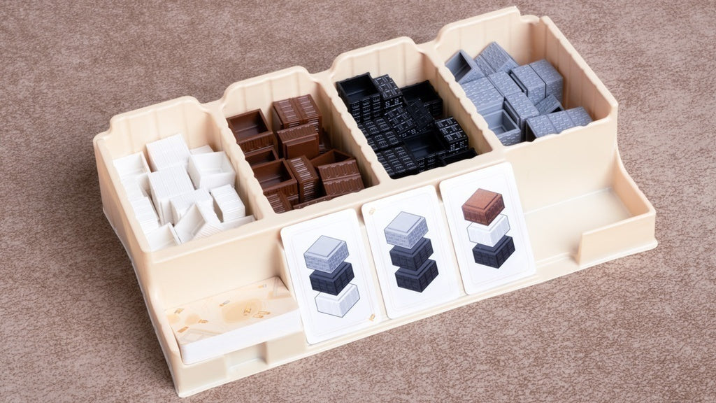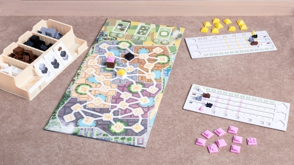 Planifica y construye: Coloca tus pisos y tejados estratégicamente, teniendo en cuenta que dos edificios adyacentes nunca pueden ser del mismo color. Al construir, debes participar en la construcción de todos los edificios adyacentes.