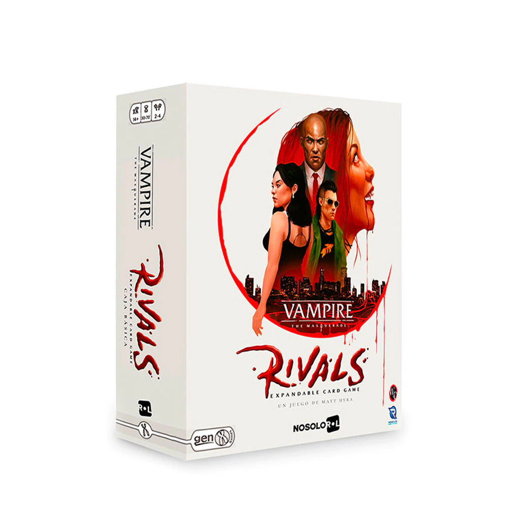 Vampire The Masquerade: Rivals es un juego de cartas ampliable para entre 2 y 4 jugadores basado en el popular juego de rol de Mundo de Tinieblas. Cada jugador asume el liderazgo de una coterie de vampiros y la usa para promover sus objetivos, reclamar títulos, reclutar a nuevos vampiros y realizar otras tareas, ¡posiblemente arriesgándose a enfrentarse al lanzarse a las calles!